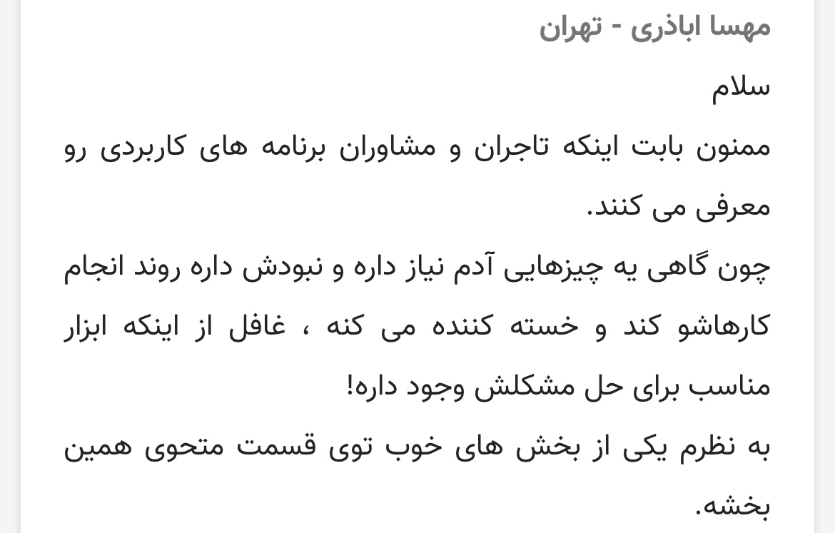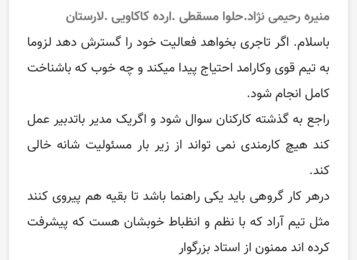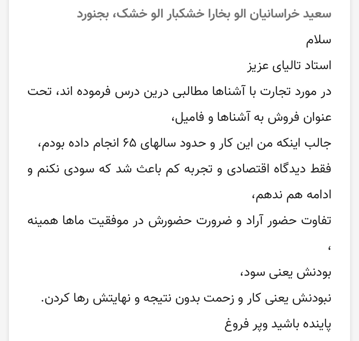 حس خوب مهمان نوازی را فقط از بزرگان یاد گرفتم و با جون دل همه دوستانی را که راهنمایی می کنم برای ورود به تجارت جزی از خانواده ی خودم می دونم و صد خودم رو برای رشدشون میذارم و خواهم گذاشت تا همیشه در کنارشون باشم مثل یه دوست ❤❤❤