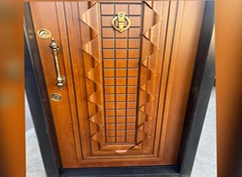 درب ضد سرقت رنگ عسلی از جنس فولاد ضد زنگ و چوب است.