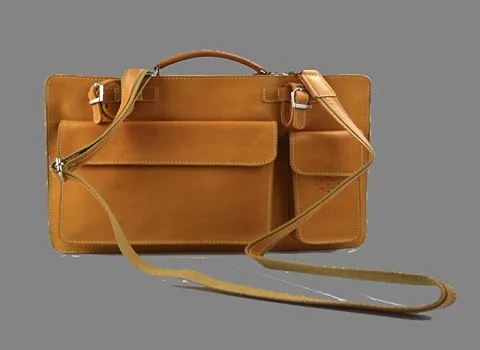 کیف چرم عسلی مردانه دارای دسته، یک بند رودوشی پهن و محکم می باشد.