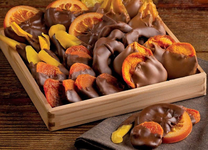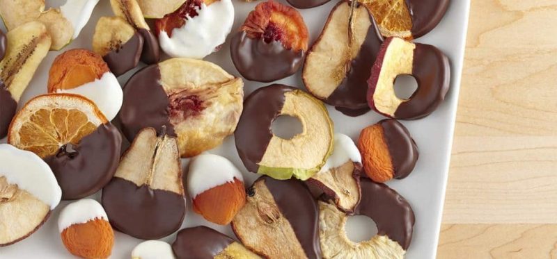 برای تهیه میوه خشک شکلاتی شما باید ابتدا بهترین و رسیده ترین نوع میوه تازه و سالم و خریداری کنید پس از شستشوی میوه ها با استفاده از یک چاقو آشپزخانه تیز آنها را به صورت ورقه های نازک برش بزنید و پس از آن ورقه های میوه را درون یک سینی قرار دهید و سینی را در مقابل نور مستقیم خورشید بگذارید و اجازه دهید که آب اضافه آن گرفته شود. زمانی که میوه ها کاملا خشک شدن آنها را درون مکانی خنک قرار دهید و در زمان استفاده مقداری از شکلات را بر روی آن بریزید و اجازه دهید که شکلات کاملا به سطح میوه بچسبد.