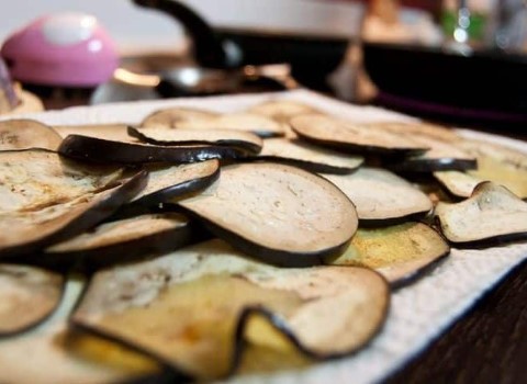 در مرحله بعد بادمجان سرخ شده را داخل ماهیتابه قرار دهید و گوشتهای پخته شده را روی بادمجانها بریزید سپس آب گوشت، آبغوره و زعفران را با هم ترکیب و روی بادمجانها و گوشتها بریزید.