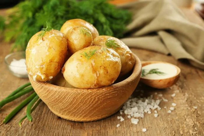 سپس آنها را به هر تعدادی که برای شما کافیست درون آب گذاشته و روی حرارت ملایمی قرا می دهید تا آب به جوش بیاید و سیب زمینیها به مرور پخته شوند زمان پخت سیب زمینی با توجه به نوع سیب زمینی و حتی اندازه آنها می تواند بین 40 تا 60 دقیقه باشد. قطعا اگر سیب زمینیهای کوچک تری را انتخاب کنید زمان پخت آن کوتاه تر خواهد بود سپس برای این که از پخت سیب زمینی مطمئن شوید می توان به واسطه یک چنگال و فرو بردن در سیب زمینی از پختن آنها مطمئن شوید.
