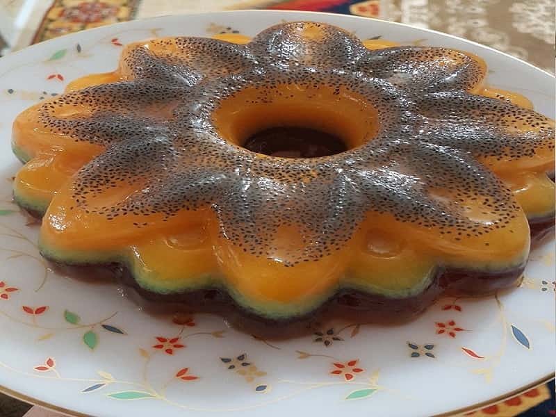 مخلوط را بر روی حرارت به طور مستمر هم بزنید تا ژله خاکشیر با پودر ژلاتین آماده شود، سپس ژله را در ظرف های مناسب تقسیم کرده و در یخچال بگذارید تا سرد شود.