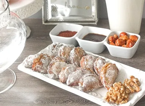 برای تهیه مواد میانی آن از گردوی خرد شده، دارچین و پودر قند استفاده کنید و این مواد را کاملاً با یکدیگر میکس کنید و چند قطره گلاب به آن اضافه کنید تا حالت خمیری به خود بگیرد و همچنین باید توجه کنید که خمیر میانی باید کاملاً سفت باشد و خمیری که شل و یا زیادی مرطوب باشد ممکن است درون فر از مواد بیرون بزند.