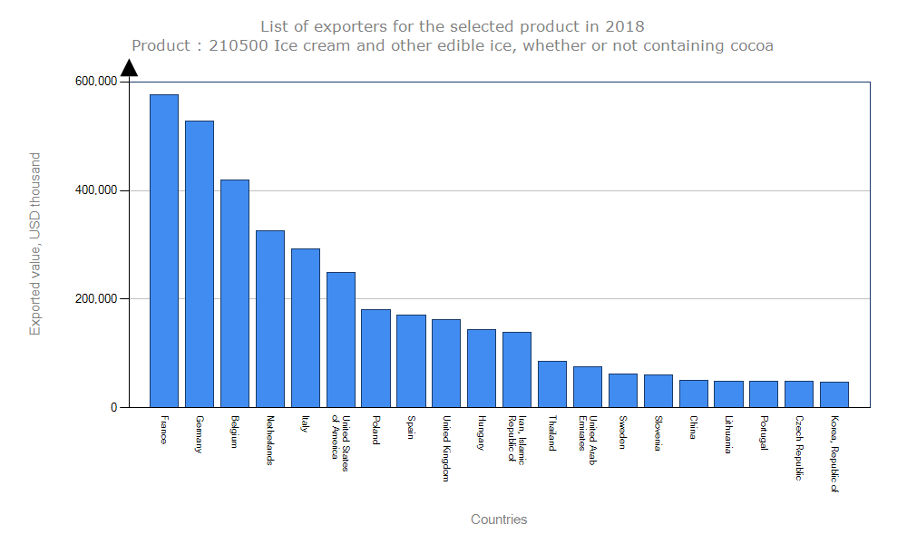 صادرات بستنی در بازار جهانی دارای نمودار تقریبا متعادلی می باشدکه فرانسه با در دست داشتن سهم ۱۳ درصدی بیشترین میزان صادرات در جهان را دارا است همچنین بعد از آن کشور های آلمان با ۱۲ درصد و بلژیک با ۱۰ درصد بیشترین صادرات را دارندکه ایران نیز در رتبه ی یازدهم صادرات بستنی با ۱۳۸,۶۴۳ هزار دلار در سال ۲۰۱۸ قرار دارد و از جمله کشور هایی که ایران با ارزش افزوده پایین می تواند به آنجا بستنی صادر می کند آمریکا است.