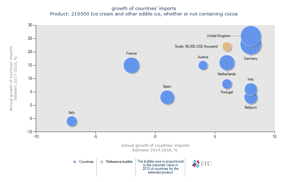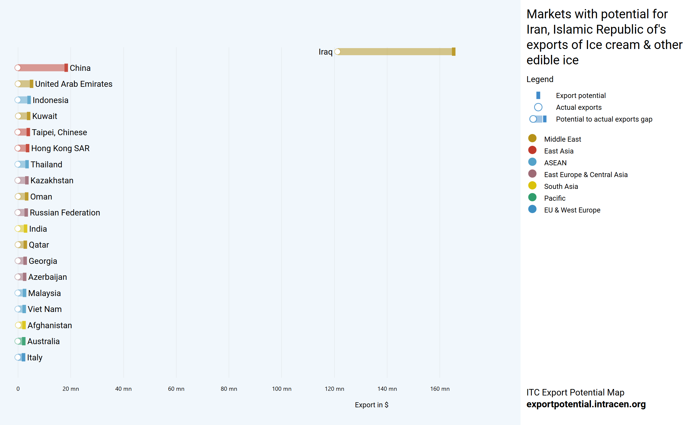 بازار عراق بیشترین ظرفیت تقاضا را برای صادرات بستنی دارد، عراق بیشترین تفاوت بین پتانسیل صادرات و صادرات واقعی را از نظر ارزش نشان می دهد، ظرفیت باقیمانده صادرات به ارزش ۴۲٫۵ میلیون دلار است همچنین جهت کسب اطلاعات بیشتر در زمینه ی صادرات انواع کالا و نیاز به مشاوره می توانید با مشاورین مجموعه نام آشنا آرادبرندینگ ارتباط برقرار کنید قطعا در این مسیر می تواند همراه خوبی برای شما باشد.