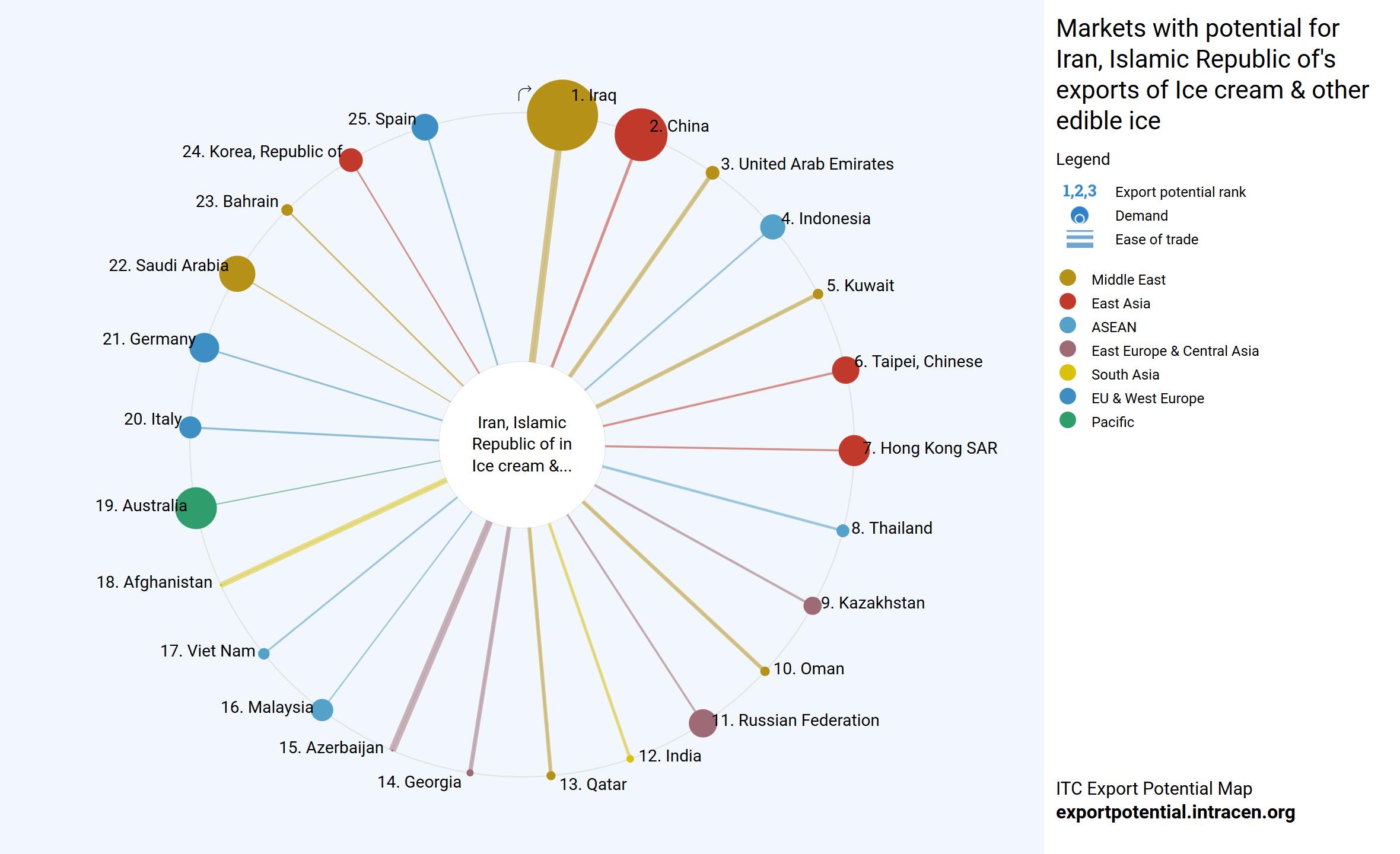 بهترین مقصدهای صادرات بستنی از ایران با توجه به میزان پتانسیل صادراتی و آسان بودن روابط تجاری دو کشور را کشور عراق، چین و امارات دارا هستندکه ایران نزدیک ترین ارتباط صادراتی را با آذربایجان دارد.