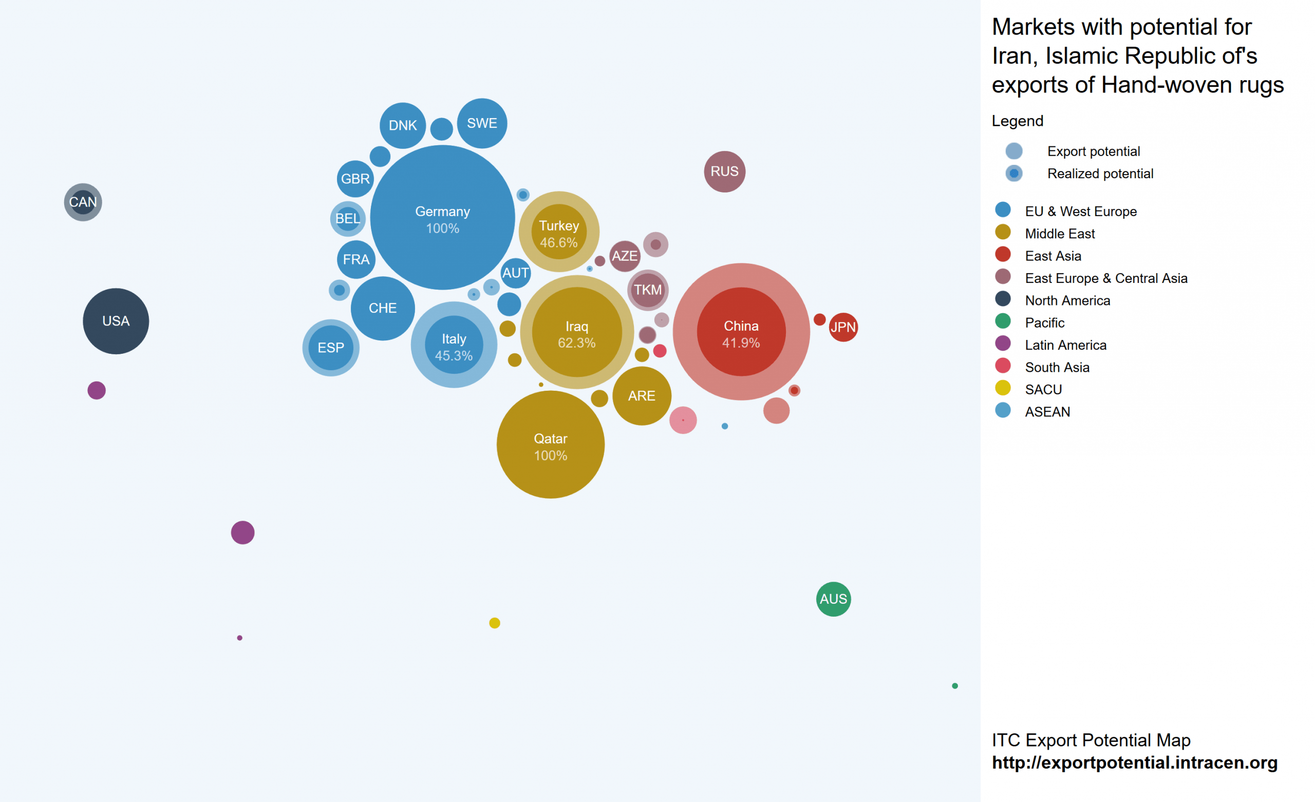 دایره داخلی و پررنگ تر هر کشور نشانگر میزان صادرات واقعی به آن کشور است و دایره کمرنگ تر دور آن نشان دهنده پتانسیل موجود بازار در آن کشور است.