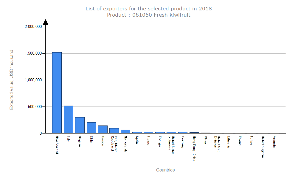پس از آن ایتالیا و نیوزیلند به ترتیب دومین و سومین تولیدکننده گان این میوه بودهو ایران نیز با تولید سالانه حدود ۲۰۰ هزار تن، چهارمین تولید کننده کیوی در جهان به شمار میرود.