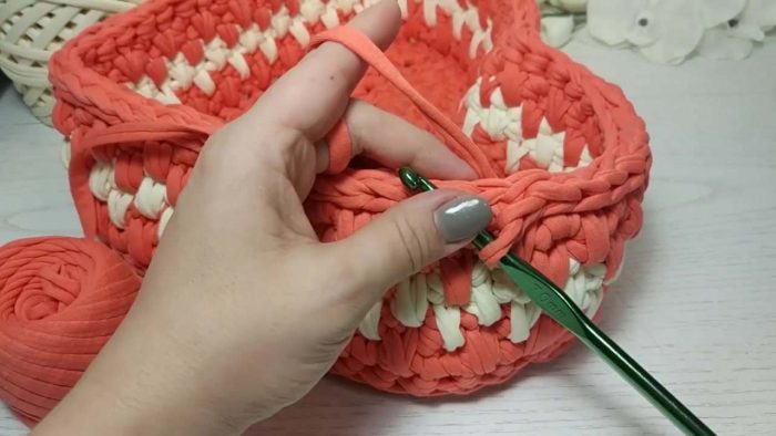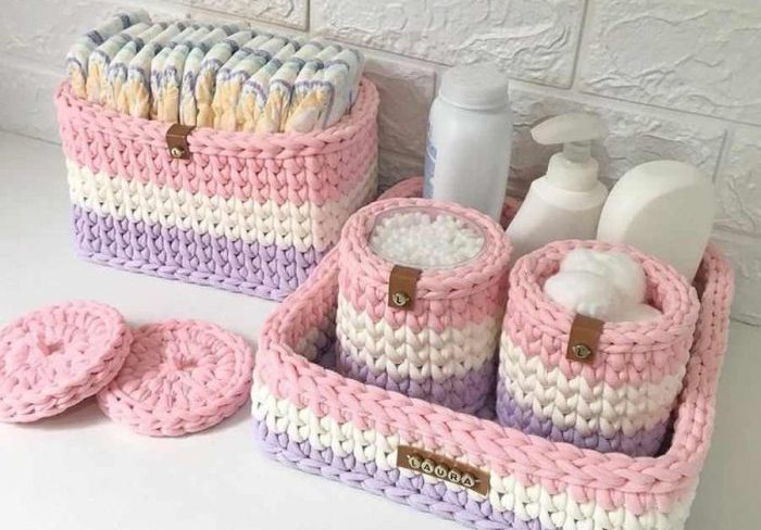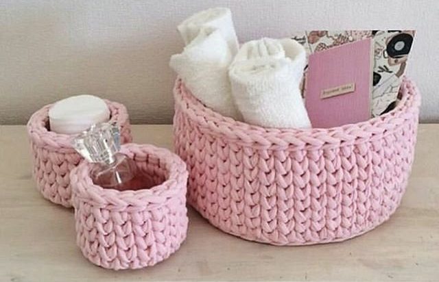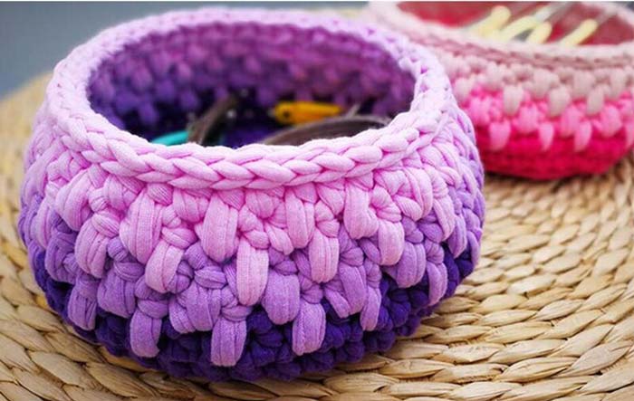 اگر به دنبال ظریفی سبد پلاستیکی برای نگهداری وسایل خاص خود هستید از نخ تریکو به بافت آن بپردازید، زیرا با استفاده از این نوع جنس نرمی و زیبایی را به محصول مورد نظر می بخشید. ابتدا کاموا را در میلها فرو کرده و کفی سبد رنگی پلاستیکی را بر روی زمین قرار می دهیم، حال شما میلها را در سوراخهای کف سبد عبود داده تا یک محکم کاری صورت گیرد تا در پایان از هم گسسته نشود. الان برای بافت از حالت ضربدری شروع کرده و از هم دیگر عبور می دهیم تا در یک نقطه آن را بریده و نوار مورد نظر را دور آن ببندیم. از قلاب برای مقاوت و نگهداری بدنه به کف و دست سبد متصل استفاده می کنیم و در پایان نیز با بستن یک روبان به صورت پاپیونی یه جلوه زیبا و خاص دهید. این محصول به دلیل داشتن مقاومت بسیار بالا برای جابجایی وسایل سنگین بسیار کارایی دارد.
