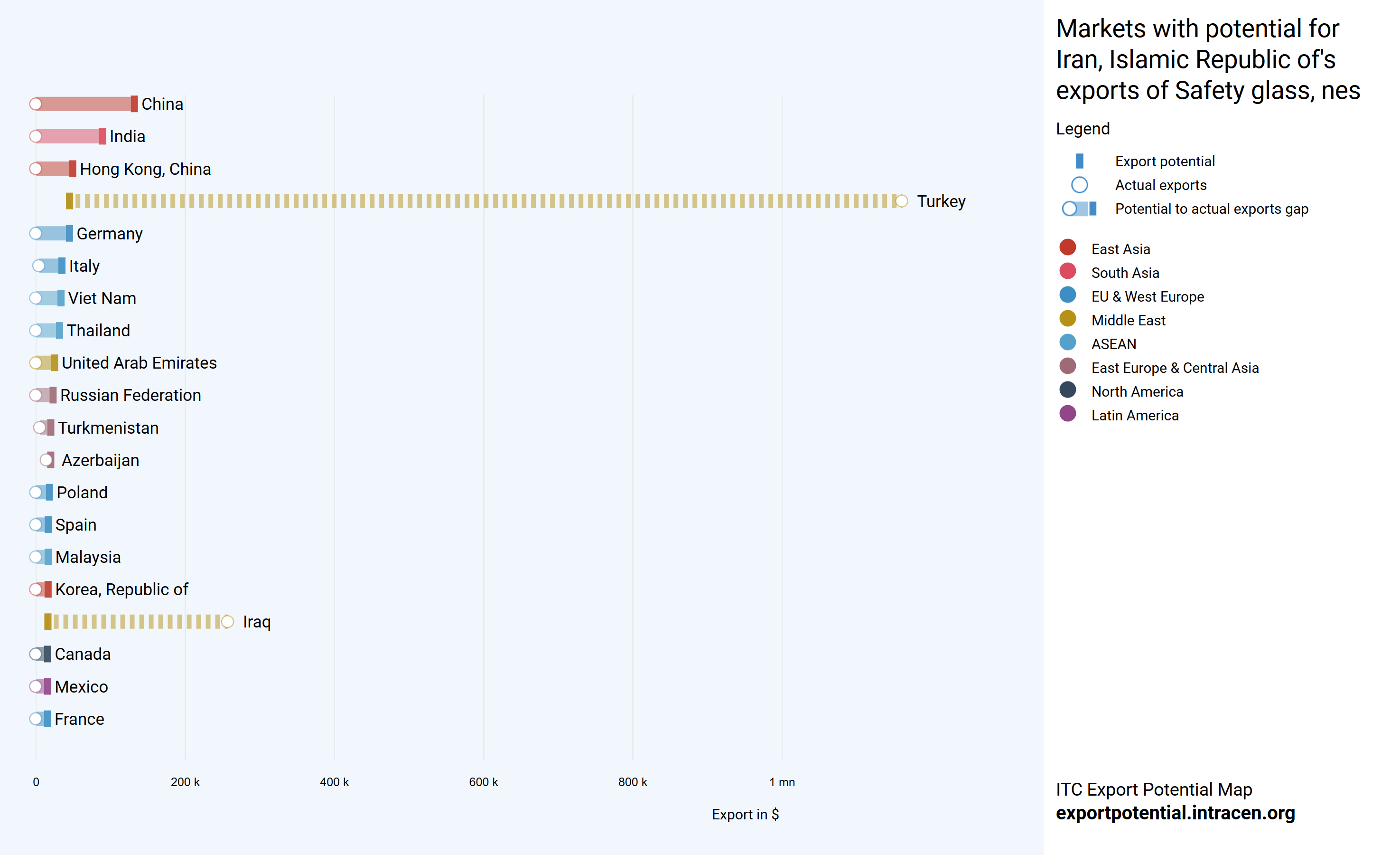چین بیشترین تفاوت بین پتانسیل صادرات و صادرات واقعی را از نظر ارزش نشان می دهد، ظرفیت باقیمانده صادرات به ارزش ۱۲۱٫۳ هزار دلار است. بیشتر بخوانید:
