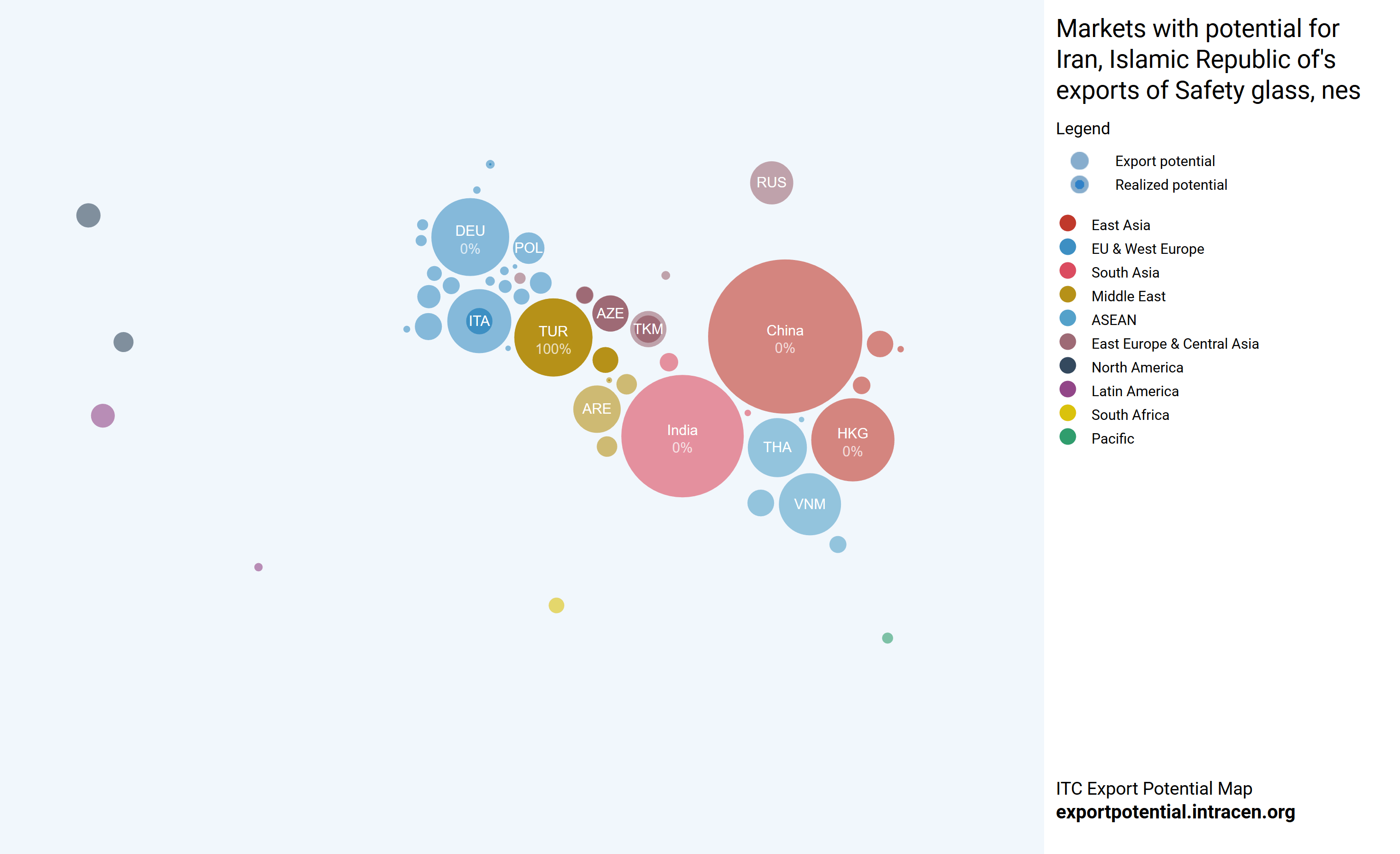دایره داخلی و پررنگ تر هر کشور نشانگر میزان صادرات واقعی به آن کشور است و دایره کمرنگ تر دور آن نشان دهنده پتانسیل موجود بازار در آن کشور است.
