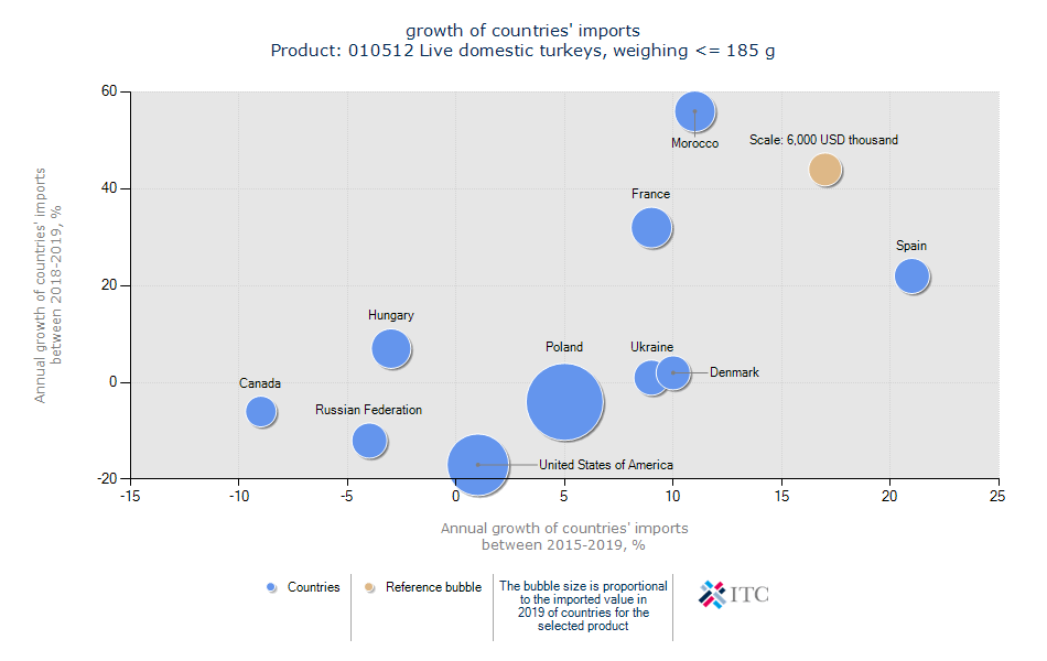 بهترین مقصد های صادرات بوقلمون از ایران با توجه به میزان پتانسیل صادراتی و آسان بودن روابط تجاری دو کشور را کشور سوریه، ارمنستان و ازبکستان دارا هستند. ایران نزدیک ترین ارتباط صادراتی را با ارمنستان دارد. بازار اوکراین بیشترین ظرفیت تقاضا را برای بوقلمون زنده دارد. سوریه بیشترین تفاوت بین پتانسیل صادرات و صادرات واقعی را از نظر ارزش نشان می دهد، ظرفیت باقیمانده صادرات به ارزش ۲٫۵ میلیون دلار است.