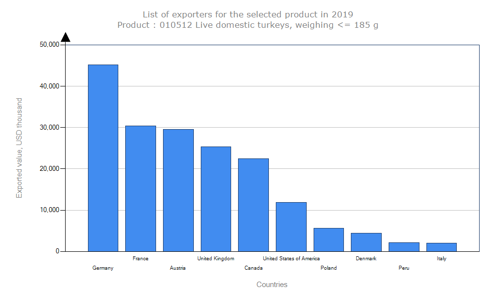 کشور آلمان با ۲۵ درصد از سهم بازار جهانی بیشترین میزان صادرات بوقلمون در جهان را دارد؛ اما این بازار به صورت انحصاری در دست هلند نیست و فرانسه و اتریش با ۱۷ درصد و ۱۶ درصد در رتبه های بعدی صادرات این محصول قرار دارند. در واردات بوقلمون لهستان ۲۱ درصد از واردات آن را در دست دارد. آمریکا و مراکش رتبه دوم و سوم واردات این پرنده را دارند.