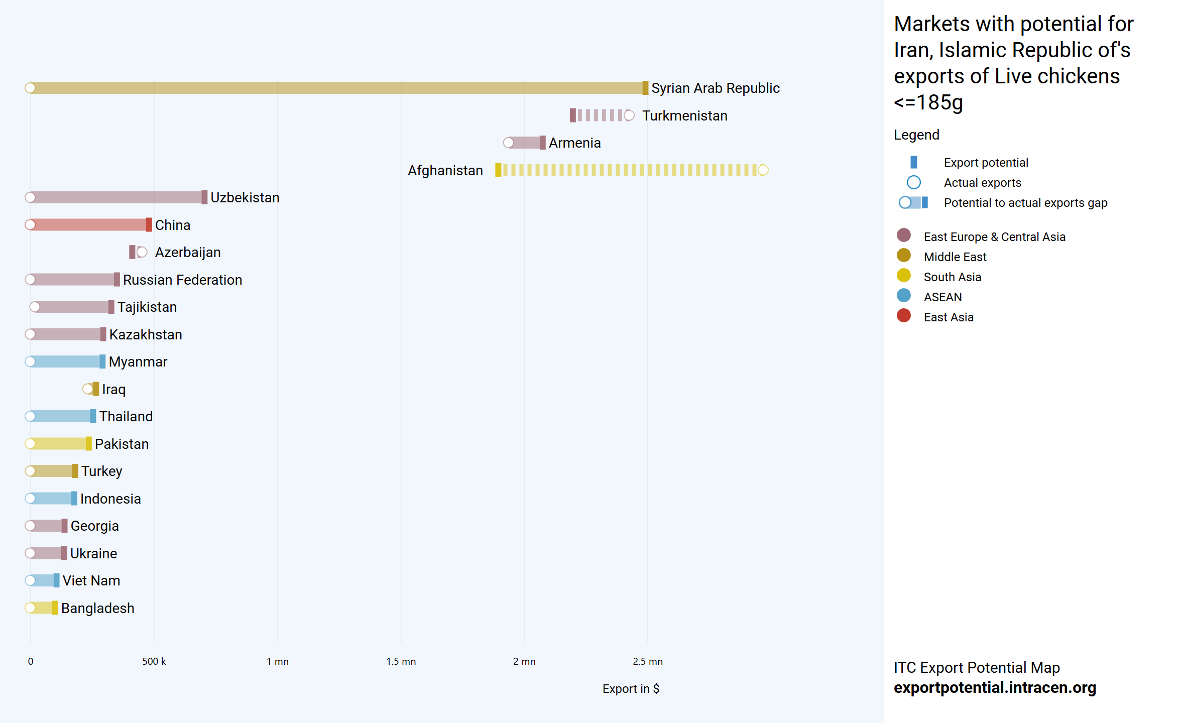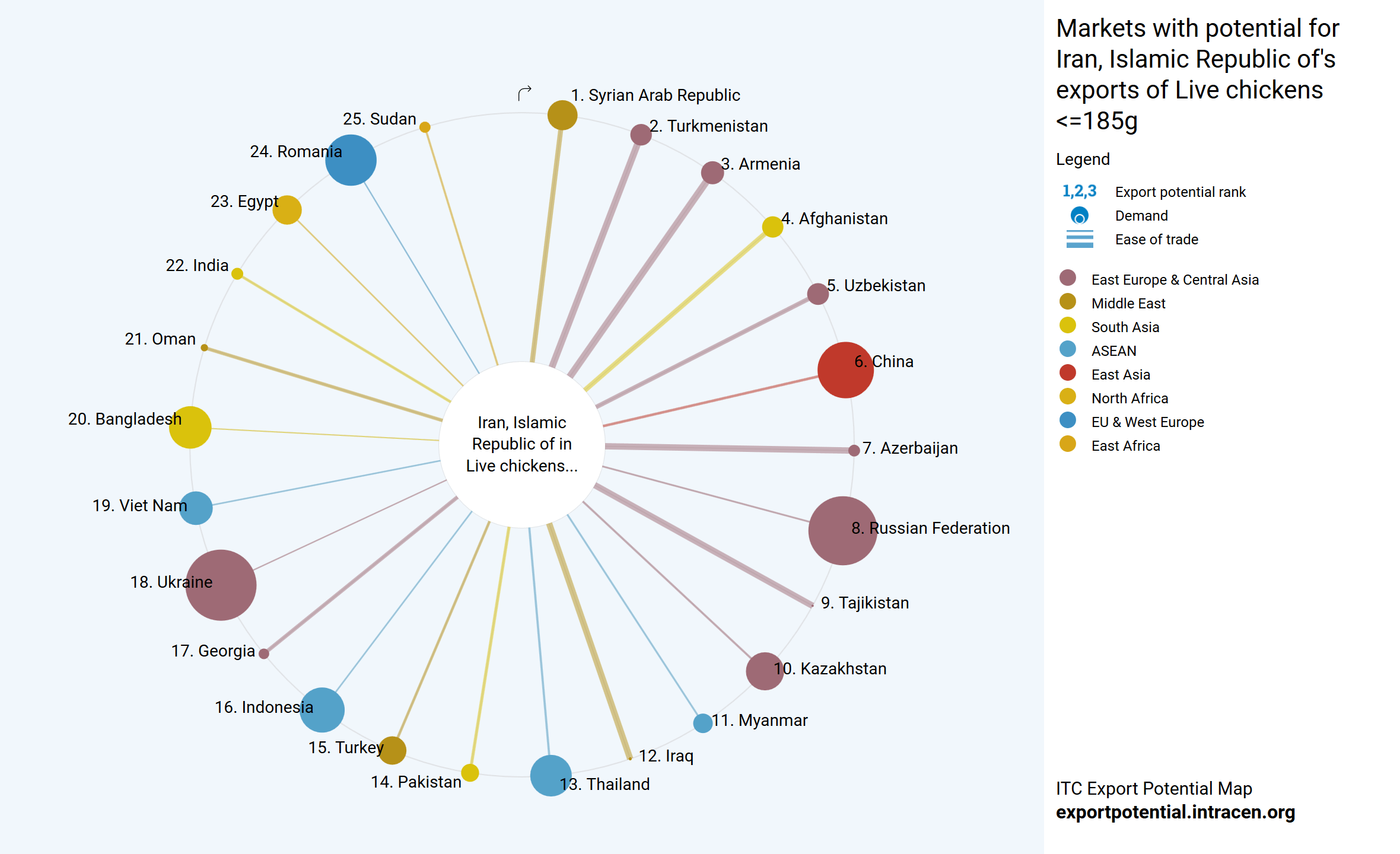 کشور های سوریه، افغانستان، چین، عراق، تایلند، پاکستان، ترکیه، اندونزی، ویتنام، بنگلادش، عمان و هند در آسیا بیشترین میزان پتانسیل صادراتی بوقلمون را دارند. ترکمنستان، ارمنستان، ازبکستان، آذربایجان، روسیه، تاجیکستان، قزاقستان، گرجستان و اوکراین در شرق اروپا و آسیای مرکزی دارای ظرفیت خوبی برای صادرات بوقلمون زنده می باشند.