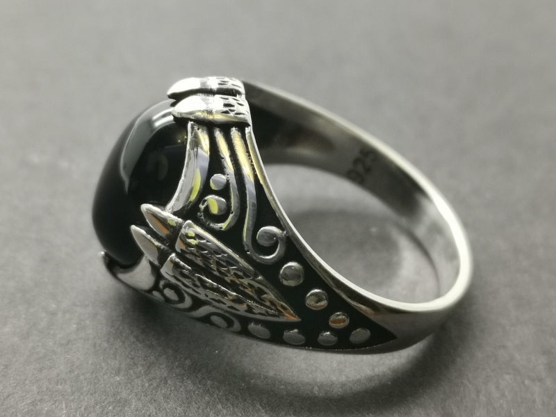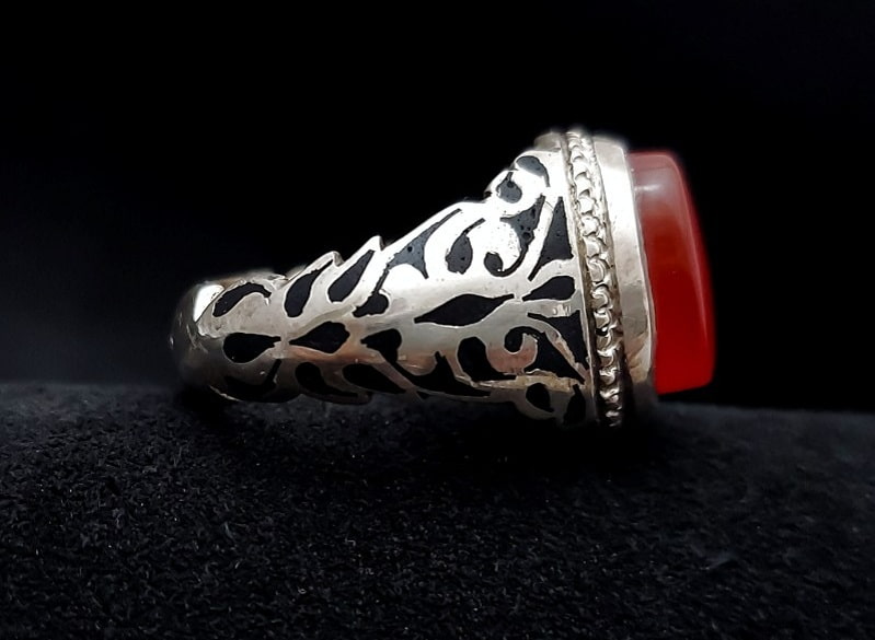 رکاب انگشتر عقیق مردانه با توجه به مدل و طرح خاص مورد نظر مشتریان، سیاه قلم، و چکش زنی که بر روی بدنه رکاب انجام می شود قیمت گذاری می شود برای زیباتر شدن جلوه ی رکابهای انگشتر مردانه در برخی اوقات استادان این عرصه از آینه کاری و شبکه کاری برروی این نوع رکابها انجام می دهند.