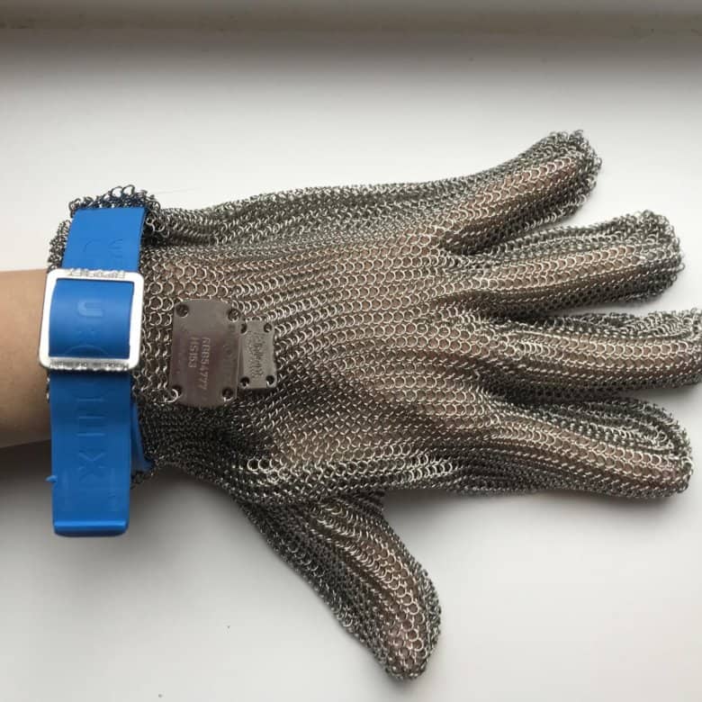 دستکش فولادی ضد برش بر گرفته از زنجیر هایی که حالت توری فلزی دارد و از آلیاژ ضد زنگ درست شده است و ظاهری مانند زره پوش جنگی است را به خود دارد.