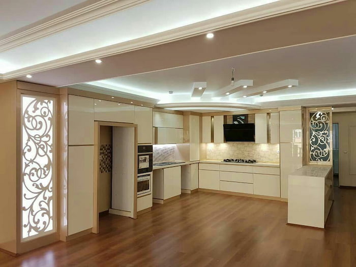 در بسیاری از این خانه ها برای نور پردازی و بهتر دیده شدن کابینتها از سقفهای کهکشانی و نورهایهالوژنی استفاده می شود برای ساخت این نوع کابینتها جنس بدنه این محصولات را از ام دی اف ساده استفاده می کنند و برای روکش و دربها از جنسهایکلاس استفاده می شود.