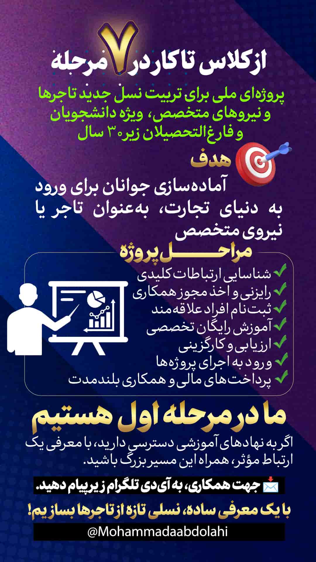 با هدف شناسایی و توانمندسازی دانشجویان و فارغالتحصیلان زیر ۳۰ سال، پروژهای ۷ مرحلهای در حال اجراست که به افراد جوان و مستعد کمک میکند تا یا به عنوان دستیار تاجران وارد عرصهی تجارت شوند یا بهعنوان تاجر مستقل فعالیت کنند.