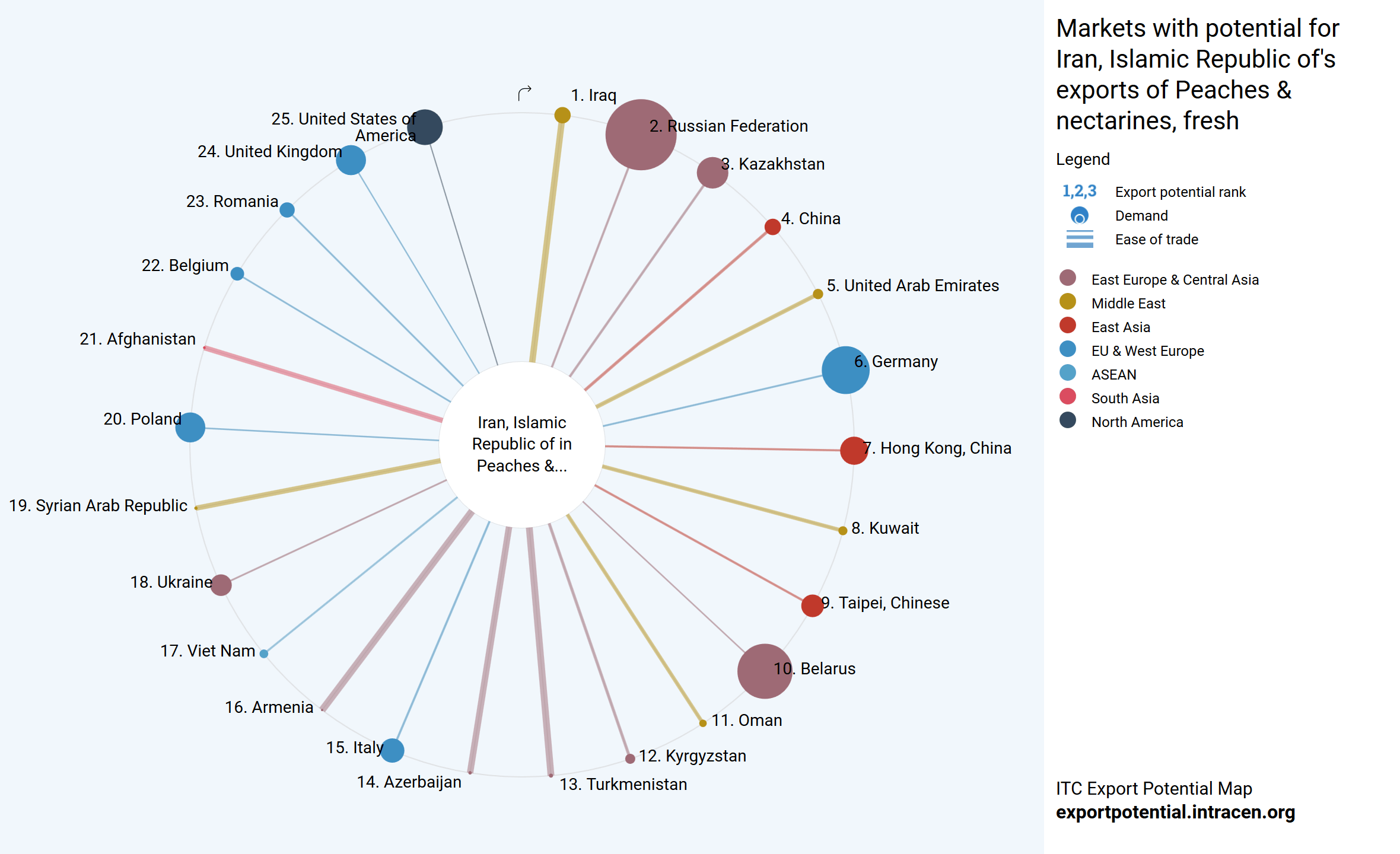 کشورهای روسیه، بلاروس و قزاقستان دارای بیشترین ظرفیت صادراتی در شرق اروپا هستند. عراق، امارات و کویت از خاورمیانه و آلمان، لهستان و انگلیس از اروپا نیز ظرفیت بالایی برای صادرات هلو از ایران دارند.