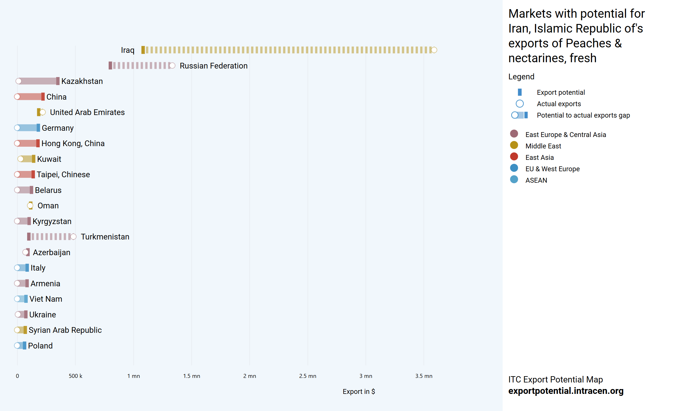 کشورهای عراق، روسیه و ترکمنستان از کشورهایی هستند که صادرات هلو به آنها بیشتر از ظرفیتشان انجام شده است.