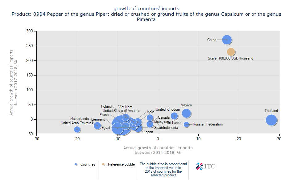 نمودار عمودی نشان دهنده مقدار رشد یکساله بازار محصول انتخابی و نمودار افقی نشان دهنده ی رشد بازار در پنج سال گذشته می باشد. هرچه نمودار به صفر نزدیکتر باشد به این معنا است که میزان رشد بازار این محصول کاهش پیدا کرده، در حال کوچکتر شدن است و دارای ظرفیت های رشد زیادی نیست. چنانچه زیر صفر و منفی باشد یعنی فرصت های تجاری این بازار در حال از بین رفتن است و آینده قابل پیش بینی ندارد و تمرکز اصلی را باید روی بازار کشورهای بالای نمودار گذاشت. حجم و اندازه دایره های این نمودار نیز نشان دهنده ی رقم میزان تجارت کشورهاست.- بیشتر بخوانید: فلفل تند سبز