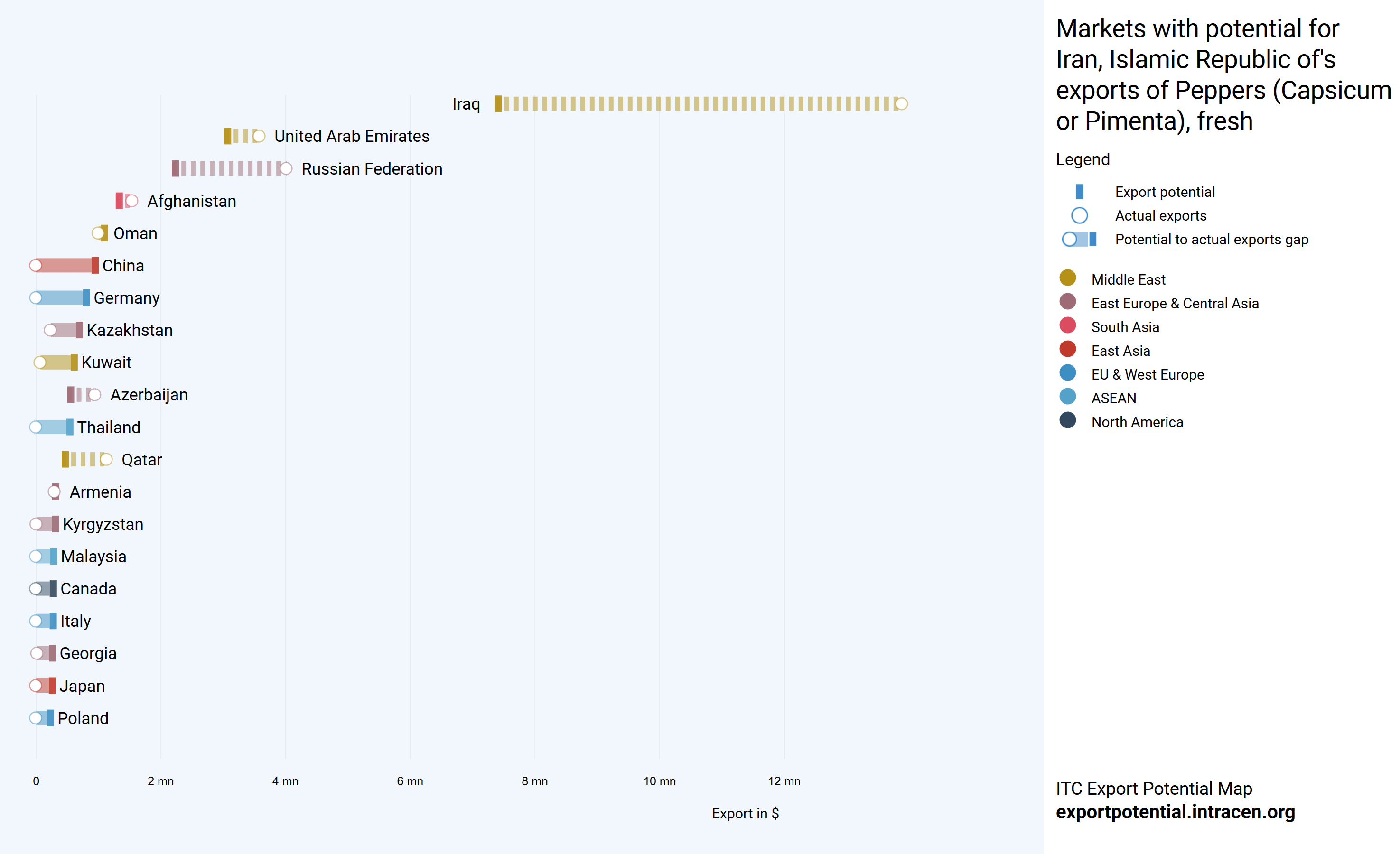 بیشترین ظرفیت و پتانسیل صادراتی برای صادرات این محصول از جمهوری اسلامی ایران را کشورهای عراق، امارات و روسیه دارا هستند. جمهوری اسلامی ایران نزدیکترین ارتباط صادراتی را با ارمنستان دارد. بازار آلمان بیشترین ظرفیت تقاضا را برای کالای ذکر شده دارد. چین بیشترین تفاوت بین پتانسیل صادرات و صادرات واقعی را از نظر ارزش نشان می دهد، ظرفیت باقیمانده صادرات به ارزش ۸۲۳٫۴ هزار دلار است. آراد برندینگ؛ اعتمادسازی در تجارت
