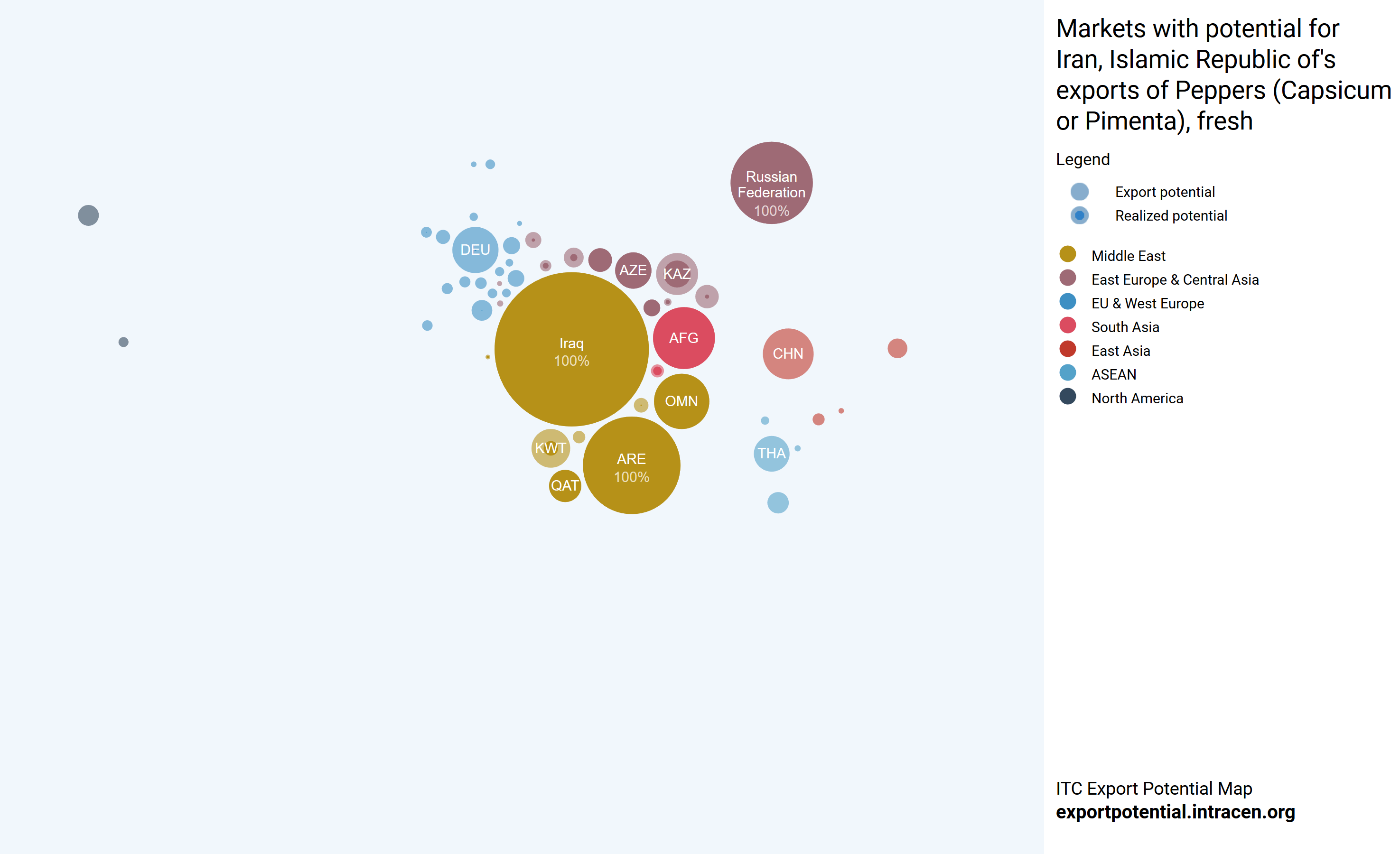 در این نقشه هر کشور با دایره و رنگ مربوط به منطقه آن نشان داده شده است. دایره داخلی و پررنگ تر هر کشور نشانگر میزان صادرات واقعی به آن کشور است و دایره کمرنگ تر دور آن نشان دهنده پتانسیل موجود بازار در آن کشور است. درصد نوشته شده در هر دایره بیانگر درصد پتانسیل صادرات به آن کشور است.