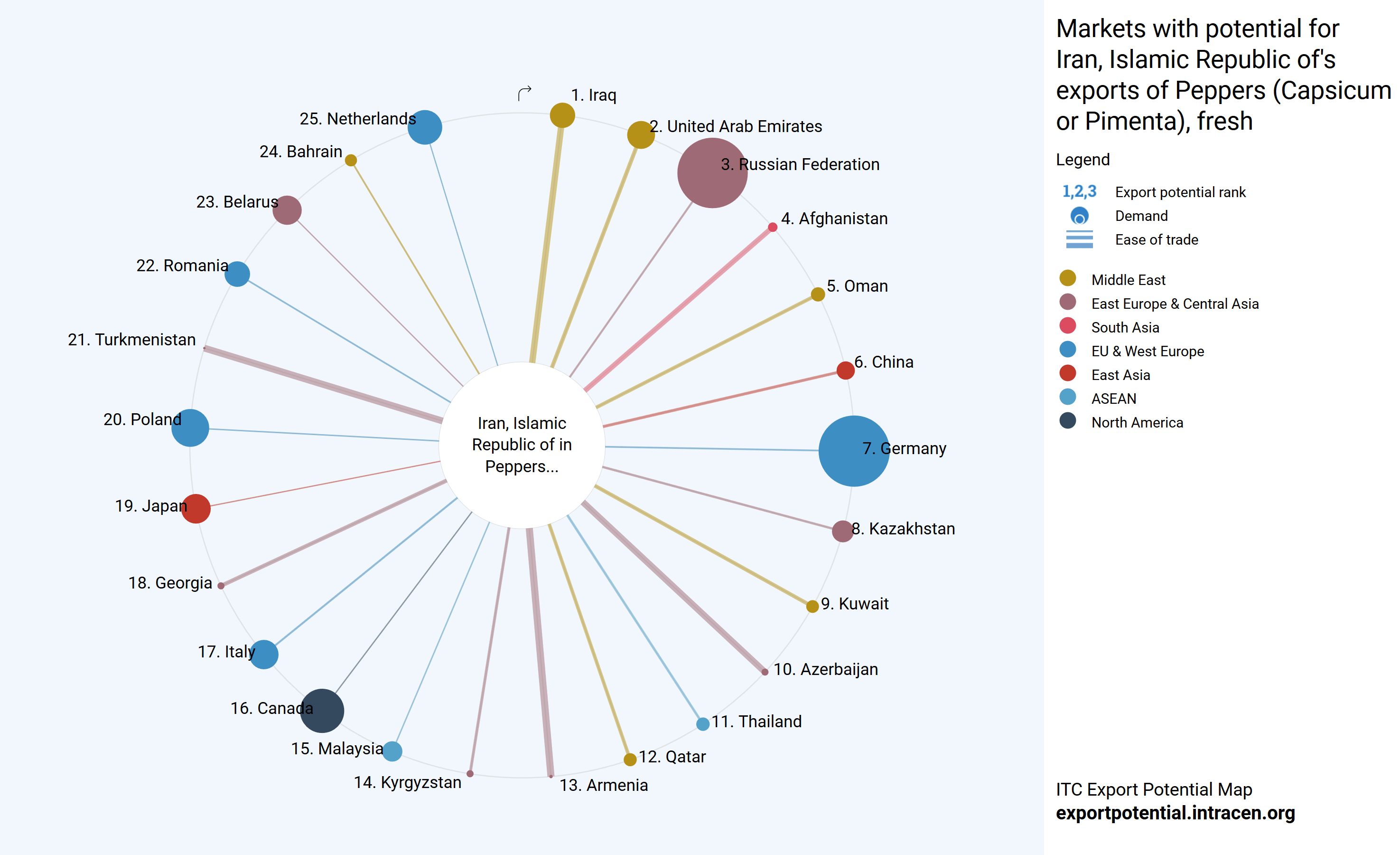 در این نمودار میزان توان و ظرفیت صادرات به کشورهای دیگر را به ترتیب عددی، که نشان دهنده ی رتبه پتانسیل صادراتی و به ترتیب اندازه دایره که نشان دهنده ی میزان تقاضای کشورها و به ترتیب پهنای خط که نشان دهنده ی سهولت معامله با آنهاست، میتوان مشاهده کرد. اسم هر کشور کنار دایره نوشته شده و رنگ دایره هر کشور طبق منطقه آن دسته بندی شده است. برای مثال دایره های قرمز کشورهای منطقه شرق آسیا را نشان میدهد.