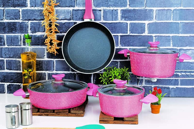 قابلمه تفلون صورتی رنگی بسیار جذاب دارد و در اندازه های مختلف موجود است.