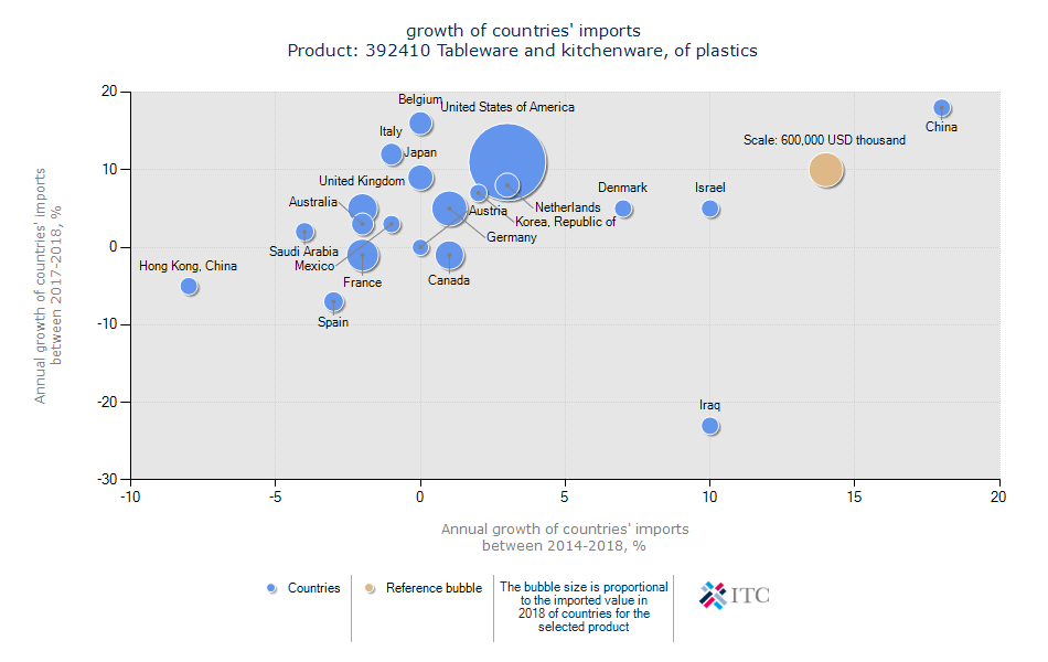 چنانچه زیر صفر و منفی باشد یعنی فرصت های تجاری این بازار در حال از بین رفتن است و آینده قابل پیش بینی ندارد و تمرکز اصلی را باید روی بازار کشورهای بالای نمودار گذاشت. حجم و اندازه دایره های این نمودار نیز نشان دهنده ی رقم میزان تجارت کشورهاست.