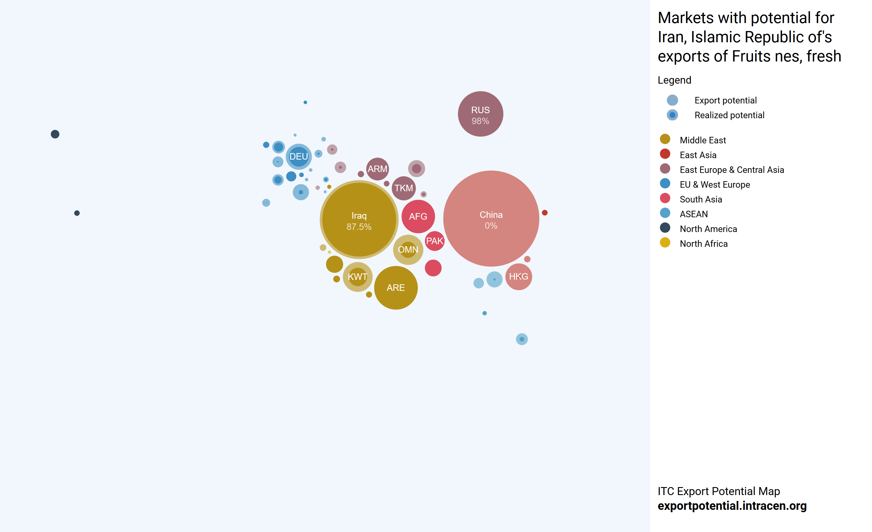 در این نقشه هر کشور با دایره و رنگ مربوط به منطقه آن نشان داده شده است. دایره داخلی و پررنگ تر هر کشور نشانگر میزان صادرات واقعی به آن کشور است و دایره کمرنگ تر دور آن نشان دهنده پتانسیل موجود بازار در آن کشور است. درصد نوشته شده در هر دایره بیانگر درصد پتانسیل صادرات به آن کشور است.