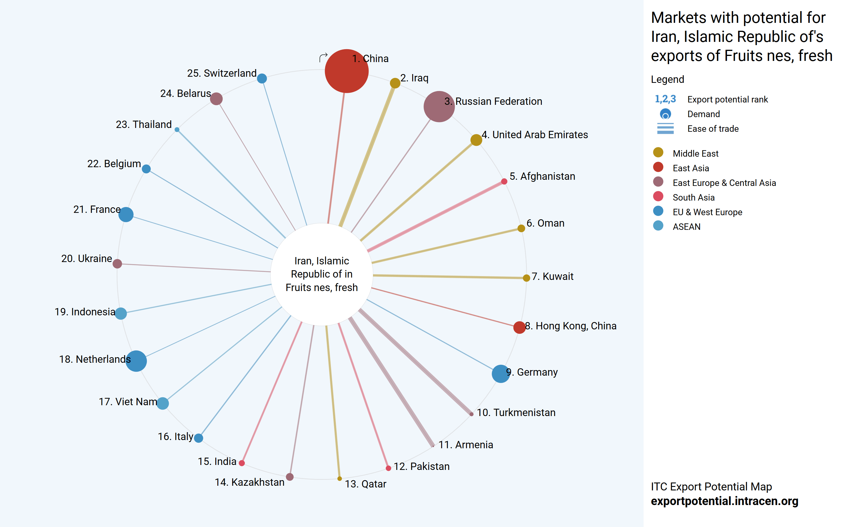 در این نمودار میزان توان و ظرفیت صادرات به کشورهای دیگر را به ترتیب عددی، که نشان دهنده ی رتبه پتانسیل صادراتی و به ترتیب اندازه دایره که نشان دهنده ی میزان تقاضای کشورها و به ترتیب پهنای خط که نشان دهنده ی سهولت معامله با آنهاست، میتوان مشاهده کرد.