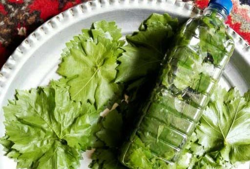 همچنین تعدادی برگ مو را بر روی یکدیگر گذاشته و به شکل لوله ای پیچانده و در داخل بطری می گذاریم؛ به همین روش ادامه می دهیم تا تمامی بطری پر شود.