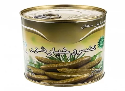 خیار شور قوطی در بسته بندی های کنسرو شده در فروشگاه ها عرضه می شود.