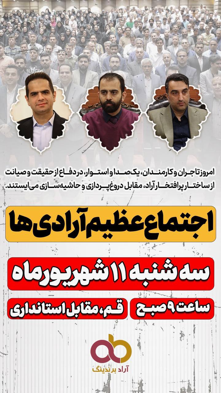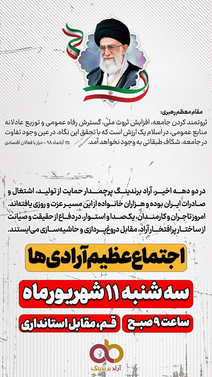 ما با پرچم جمهوری اسلامی ایران و عکس حضرت آقا در اجتماع عظیم آرادی ها سه شنبه ۱۱ شهریور ماه ساعت ۹ صبح مقابل استانداری شرکت می کنیم تا هیچ خائن ضدانقلاب وطن فروشی نتواند سوءاستفاده کند چون ما آرادی ها عاشق ایرانیم.