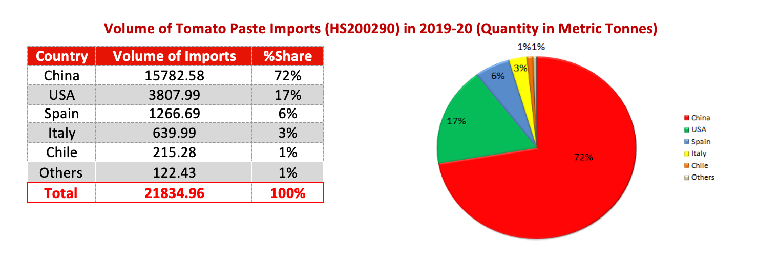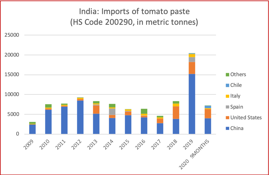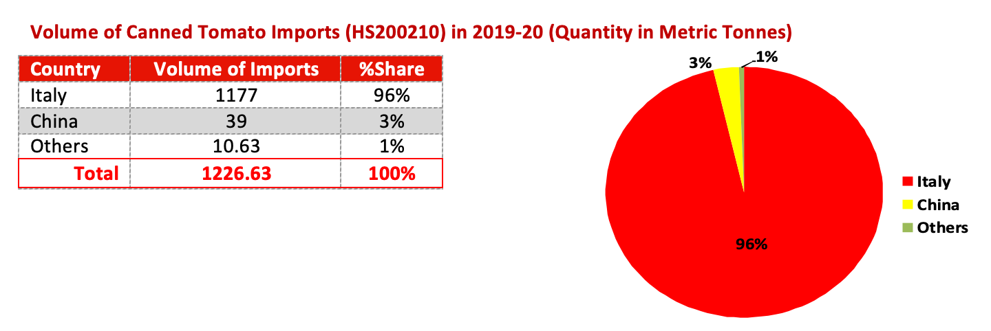 در سال 2019-2020، ایتالیا بیشترین سهم صادرات کنسرو گوجه فرنگی را به هند و پس از آن چین به دست آورد. واردات کنسرو گوجه فرنگی از بریتانیا، هلند و اسپانیا تقریبا 1 درصد از کل واردات را تشکیل می دهد. در سال 2019-2018، مقداری گوجه فرنگی کنسرو شده تنها از امارات و استرالیا وارد شد، اما در سال 2019، وارداتی از این کشورها ثبت نشد. ارزش کل واردات گوجه فرنگی کنسرو شده در هند، در طول سال 2019 به کمتر از 0.94 میلیون دلار آمریکا رسید و این کشور بیشتر به دنبال واردات فله ای این محصول بود.