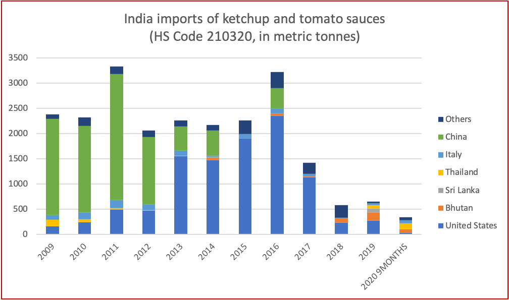 حجم کل واردات سس گوجه فرنگی HS210320 در هند به 640.94 تن متریک در طول سال 2020-2019 رسید. ارزش کل این واردات در سال 2020 با 2.6 درصد کاهش به 733000 دلار آمریکا رسید. بیشترین واردات از ایالات متحده آمریکا، بوتان، سریلانکا، تایلند و ایتالیا بوده است.