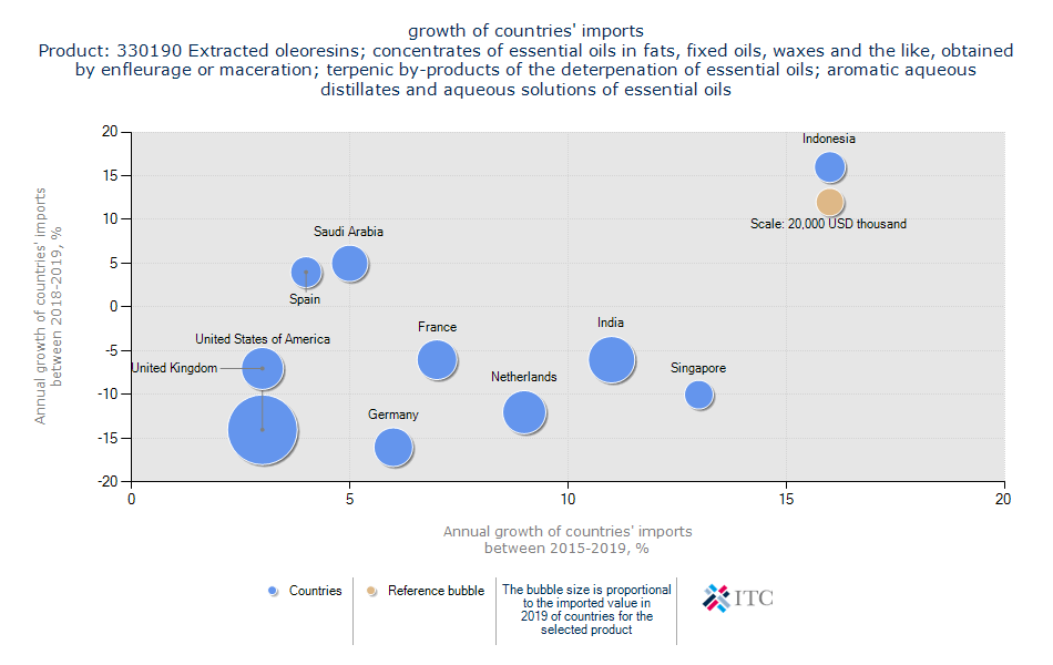 بازار صادراتی این محصول در کشورهای اندونزی، عربستان و اسپانیا دارای رشد مثبت طی یک و پنج سال گذشته بوده است. سنگاپور، هند، هلند، فرانسه، آلمان، آمریکا و انگلیس نیز دارای رشد مثبت در پنج سال گذشته می باشند.