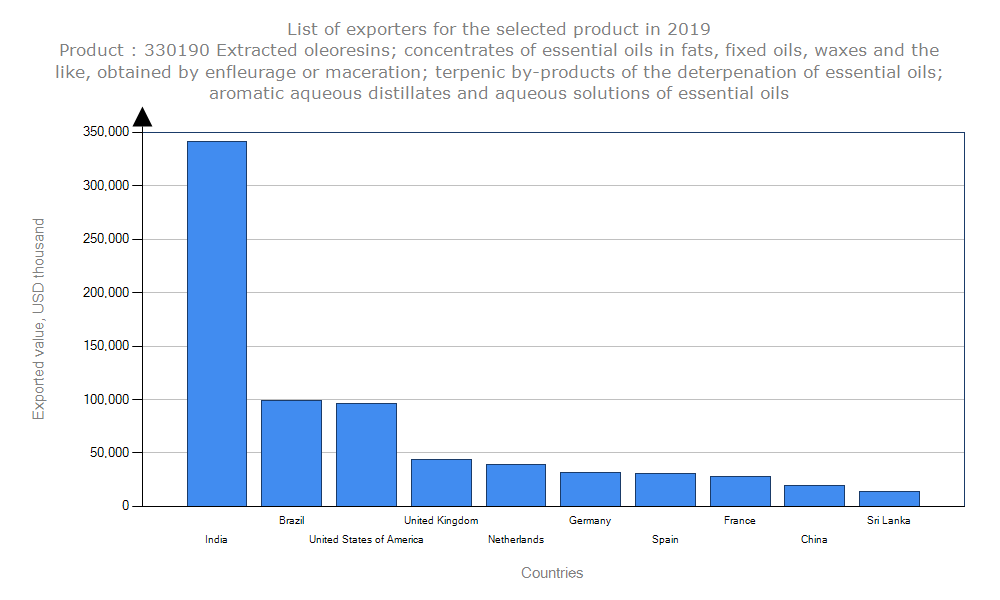 هند با صادرات ۳۸ درصد از سهم بازار جهان عمده ترین صادر کننده گلاب در جهان است. برزیل، آمریکا، انگلیس و هلند به ترتیب با ۱۱، ۱۱، ۵ و ۴ درصد از سهم صادرات این محصول در جهان در رتبه های بعدی قرار می گیرند.