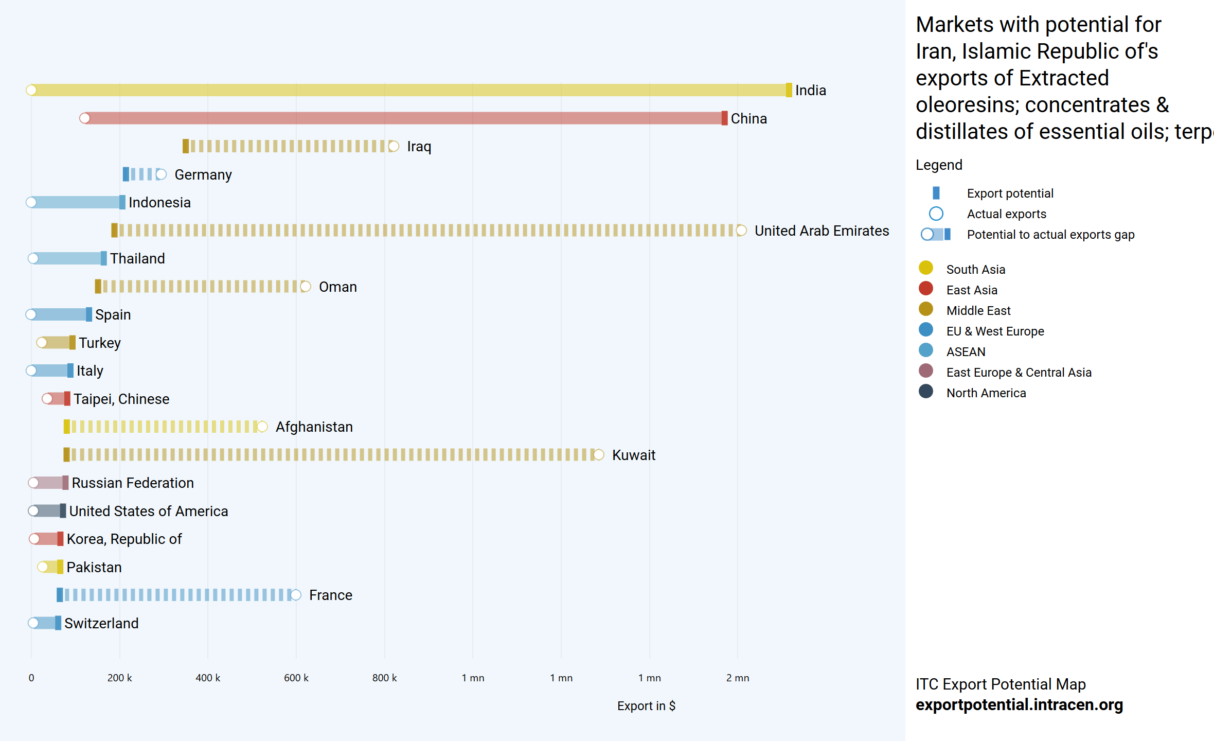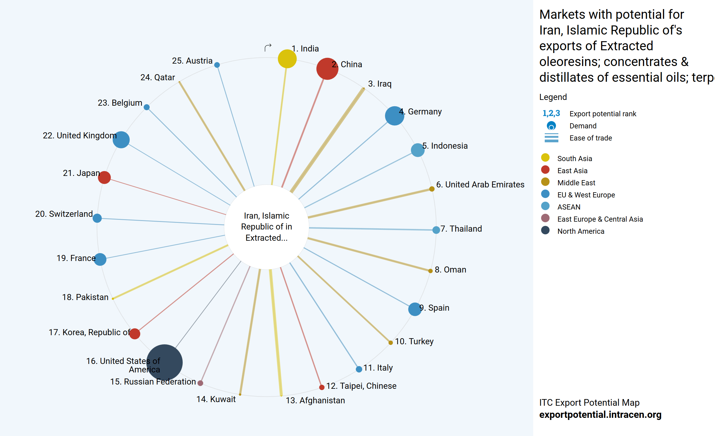 ایران نزدیکترین ارتباط صادراتی را با عراق دارد. بازار آمریکا بیشترین ظرفیت تقاضا را برای صادرات این محصول دارد. هند بیشترین تفاوت بین پتانسیل صادرات و صادرات واقعی را از نظر ارزش نشان می دهد، ظرفیت باقی مانده صادرات به ارزش ۱٫۷ میلیون دلار است.
