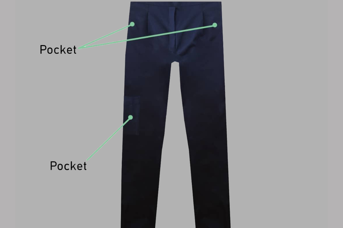 با توجه به نوع کار و فعالیت این شلوار جیب دار یا بدون جیب طراحی می شود که معمولا دو جیب هستند و در بعضی مواقع تعداد جیب بیشتری دارند که می توان اشیای بیشتری را درون آنها قرار داد و این بستگی به نوع فعالیت و کار دارد مثلا برای افراد مکانیک شلوار کار با چندین جیب طراحی می شود که بتوانند ابزار کار خود را مثل آچار، پیچ گوشتی و غیره در آن قرار دهند و در حین تعمیر اتومبیل از آنها استفاده کنند و در دسترس باشند.