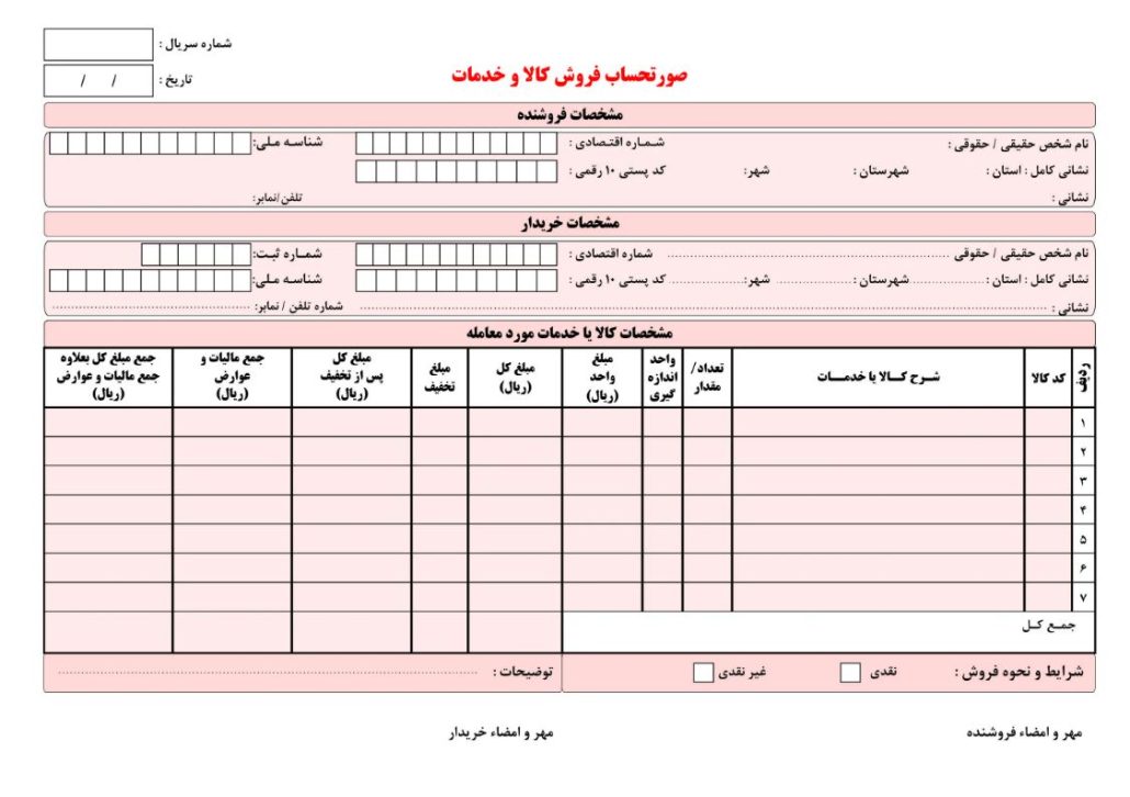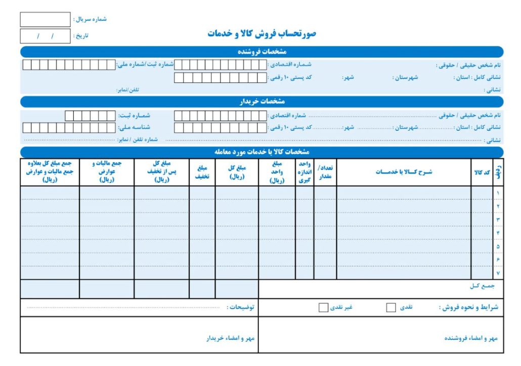 - ثبت کامل مشخصات خریدار و فروشنده، هر چه این اطلاعات دارای جرئیات بیشترو دقیق تری باشد فاکتور از بار حقوقی بیشتری برخوردار بوده و قابل رسیدگی بیشتری است.