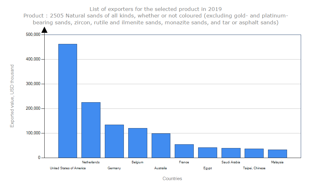 بزرگترین صادرکننده شن و ماسه در دنیا آمریکا با در دست داشتن ۲۸ درصد از سهم بازار جهانی است. در رتبه های بعدی هلند با ۱۴ درصد، آلمان ۸ درصد، بلژیک ۷ درصد و استرالیا با ۶ درصد سهم صادرات شن و ماسه در دنیا قرار دارند. در مقابل کشور کانادا با ۱۲ درصد از سهم واردات این محصول بیشترین واردات را دارد. چین و هلند در رتبه های بعدی قرار دارند.