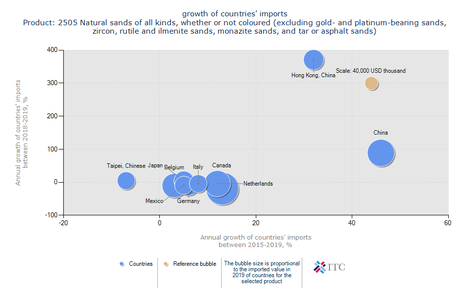 با توجه به نمودار بالا هنگ کنگ چین و چین دارای رشد ۳۷۱ و ۸۹ درصدی در یک سال بوده اند و در مجموع رو به رشد ترین مقاصد صادراتی شن و ماسه می باشند. کشورهای هلند،کانادا، ایتالیا، آلمان، بلژیک، مکزیک و ژاپن نیز از جمله کشورهای دارای رشد پنج ساله در واردات شن و ماسه هستند. بیشترین ظرفیت و پتانسیل صادراتی برای صادرات شن و ماسه با توجه به ظرفیت بازار و روابط تجاری آسان را کشورهای ترکیه، آلمان، سنگاپور و بلژیک دارا هستند. ایران نزدیکترین ارتباط صادراتی را با ترکیه دارد. بازار کانادا بیشترین ظرفیت تقاضا را برای کالای ذکر شده دارد.