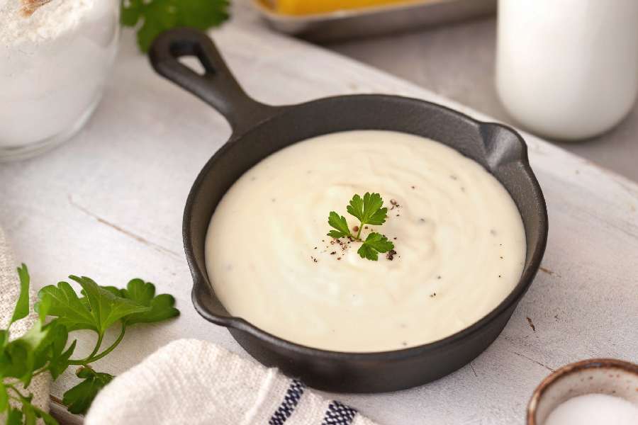 این سس بر پایه آرد و شیر تهیه می شود و علا رغم داشتن ترکیبات اندک، طعمی فوق العاده دارد.