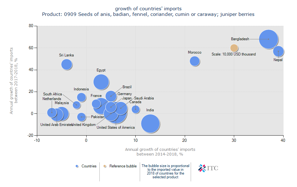 چنانچه زیر صفر و منفی باشد یعنی فرصت های تجاری این بازار در حال از بین رفتن است و آینده قابل پیش بینی ندارد و تمرکز اصلی را باید روی بازارهای کشورهای به سمت بالای نمودار متمرکز کرد. حجم و اندازه دایره های این نمودار نیز نشان دهنده ی رقم میزان تجارت کشورهاست.