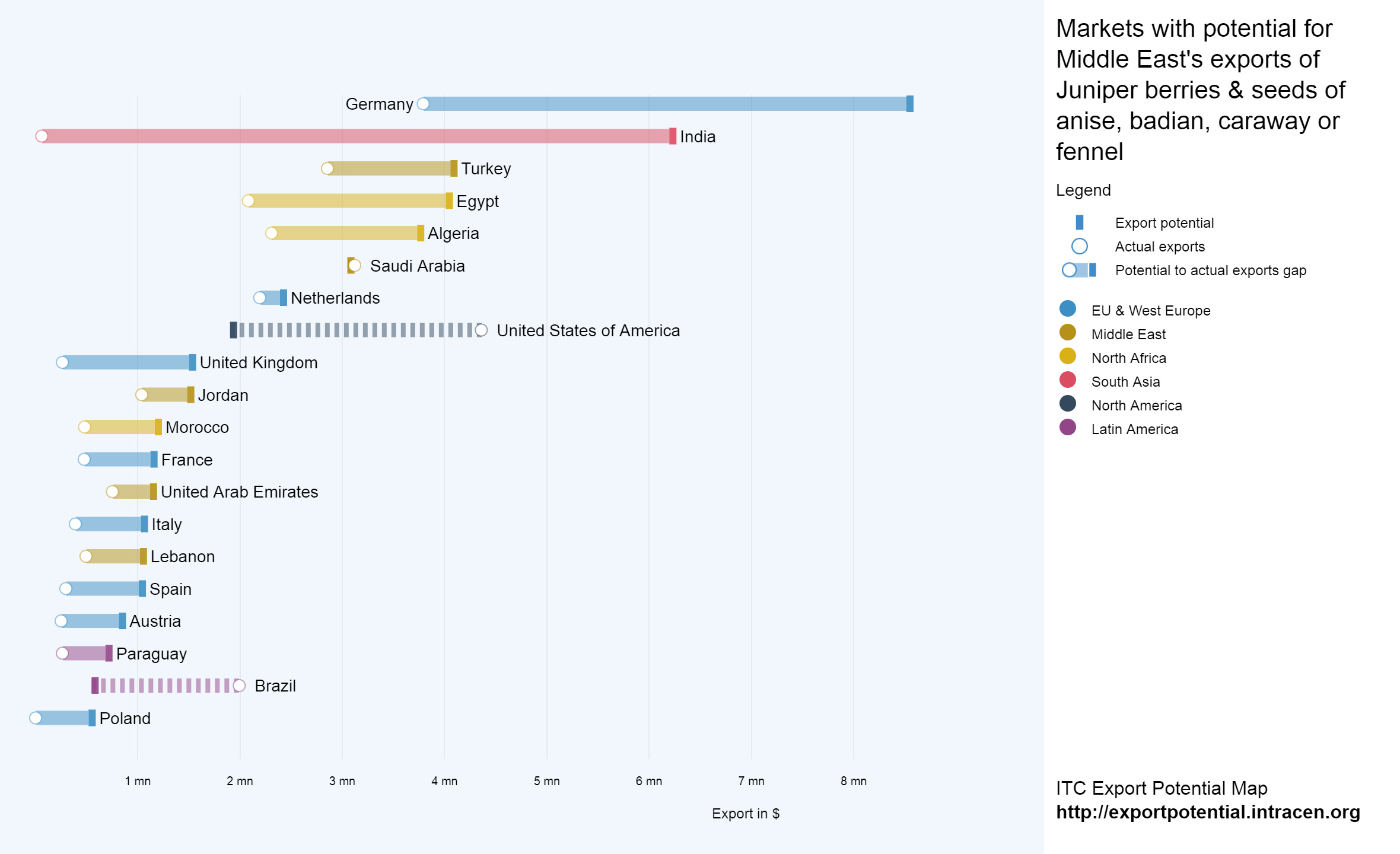 بیشترین ظرفیت و پتانسیل صادراتی برای صادرات این محصول از خاورمیانه را کشورهای آلمان، هند و ترکیه دارا هستند. هند بیشترین تفاوت بین پتانسیل صادرات و صادرات واقعی را از نظر ارزش نشان می دهد، ظرفیت باقیمانده صادرات به ارزش ۶٫۱ میلیون دلار است.