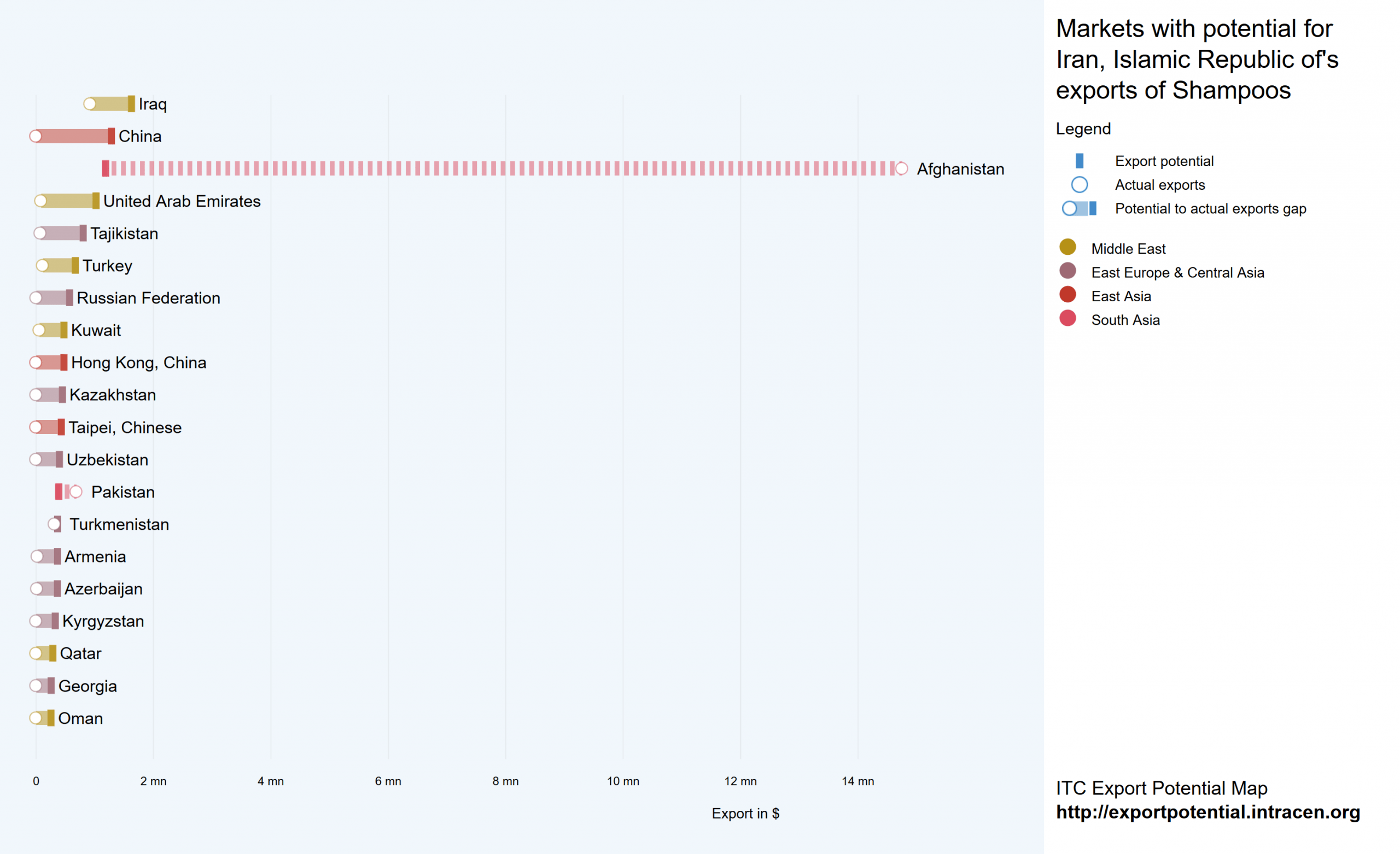 چین بیشترین تفاوت بین پتانسیل صادرات و صادرات واقعی را از نظر ارزش نشان می دهد، ظرفیت باقیمانده صادرات به ارزش ۱٫۲ میلیون دلار است.