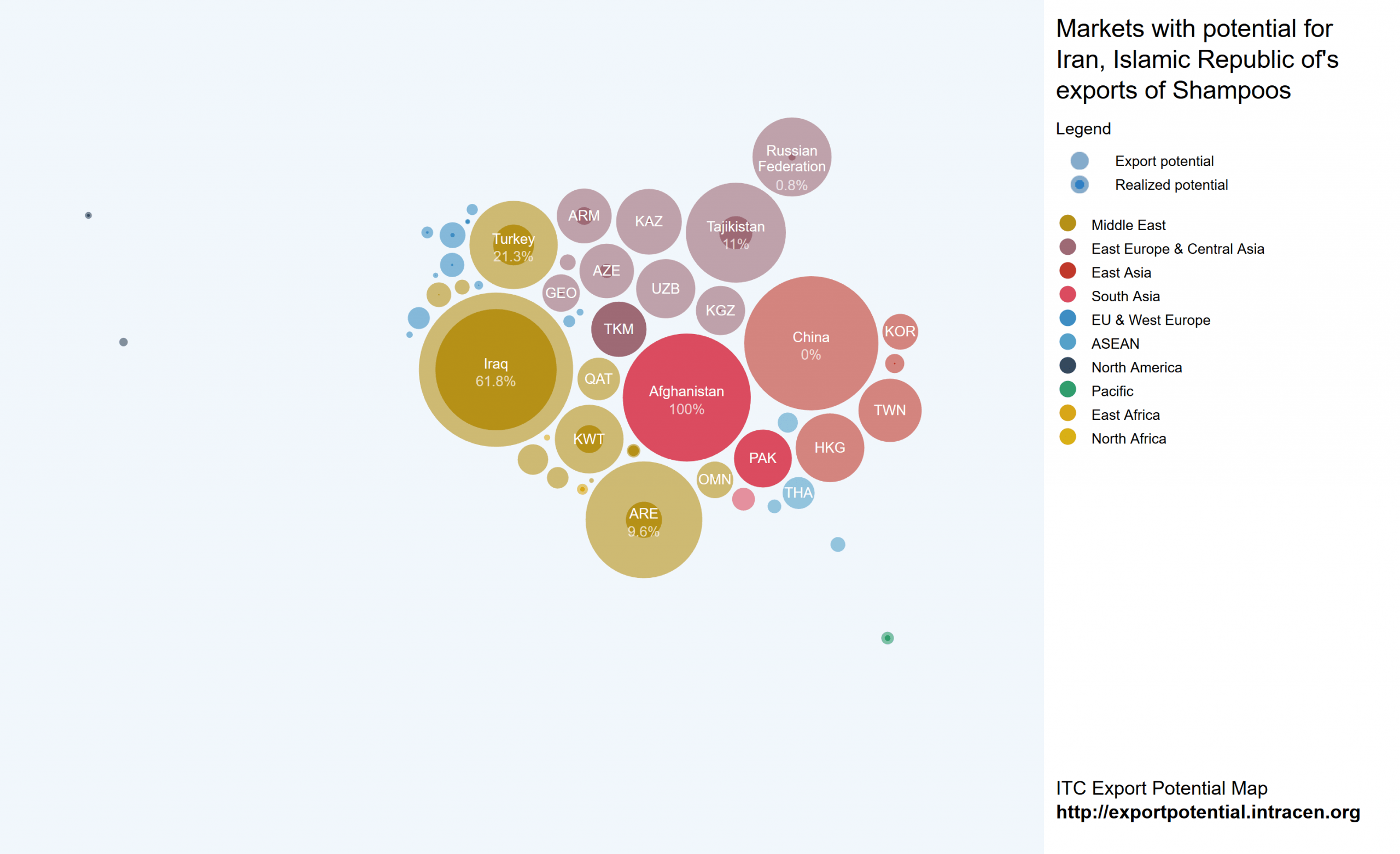 دایره داخلی و پررنگ تر هر کشور نشانگر میزان صادرات واقعی به آن کشور و دایره کمرنگ تر دور آن نشان دهنده پتانسیل موجود بازار در آن کشور است.
